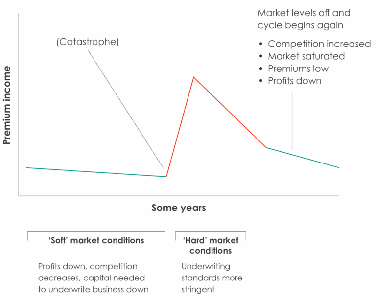 During a hypothetical “soft” period in the cycle (see above), premiums are low, the capital base is high, and competition is high. Premiums continue to fall as insurers take greater risks to compete or risk losing business in the long term.