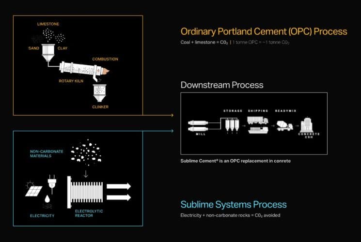 Electricity can be generated from wind, solar, or other renewable energy sources, and Sublime does not rely on limestone as a feedstock.
