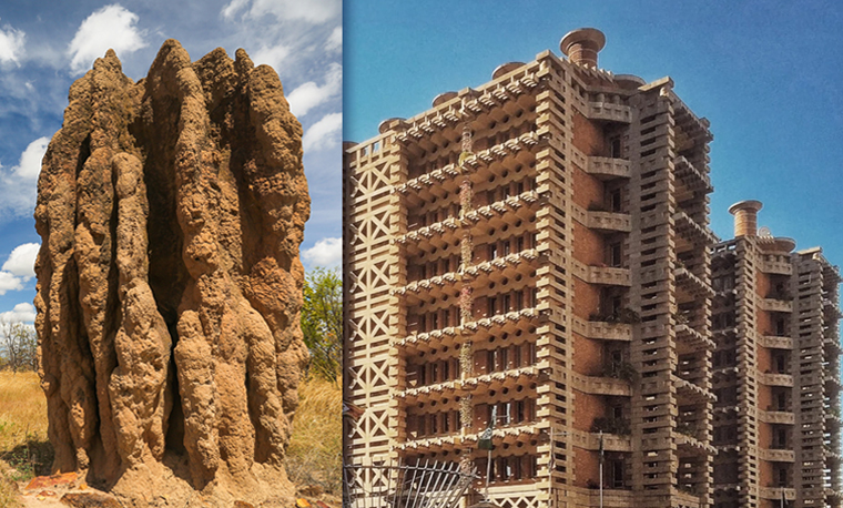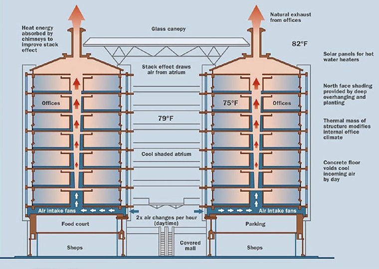 Architect Mick Pearcedesigned probably the first building in the world to be cooled by entirely natural means – inspired by the ventilation design of termite mounds. Constructed like a chimney, the mound warms by the sun during the day, and by nightfall, the air inside the mound is warmer than outside. As the outdoor temperature falls, warm air naturally vents out the top of the chimney, which draws cool air in through underground tunnels.